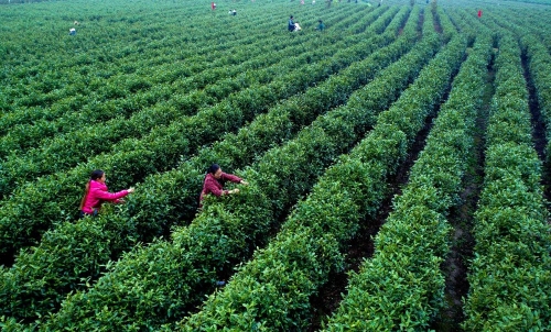 ↑在位于秦嶺南麓的陜西平利縣城關(guān)鎮(zhèn)金華村,茶農(nóng)在茶園里采摘春茶(無(wú)人機(jī)照片,2018年3月25日攝)。