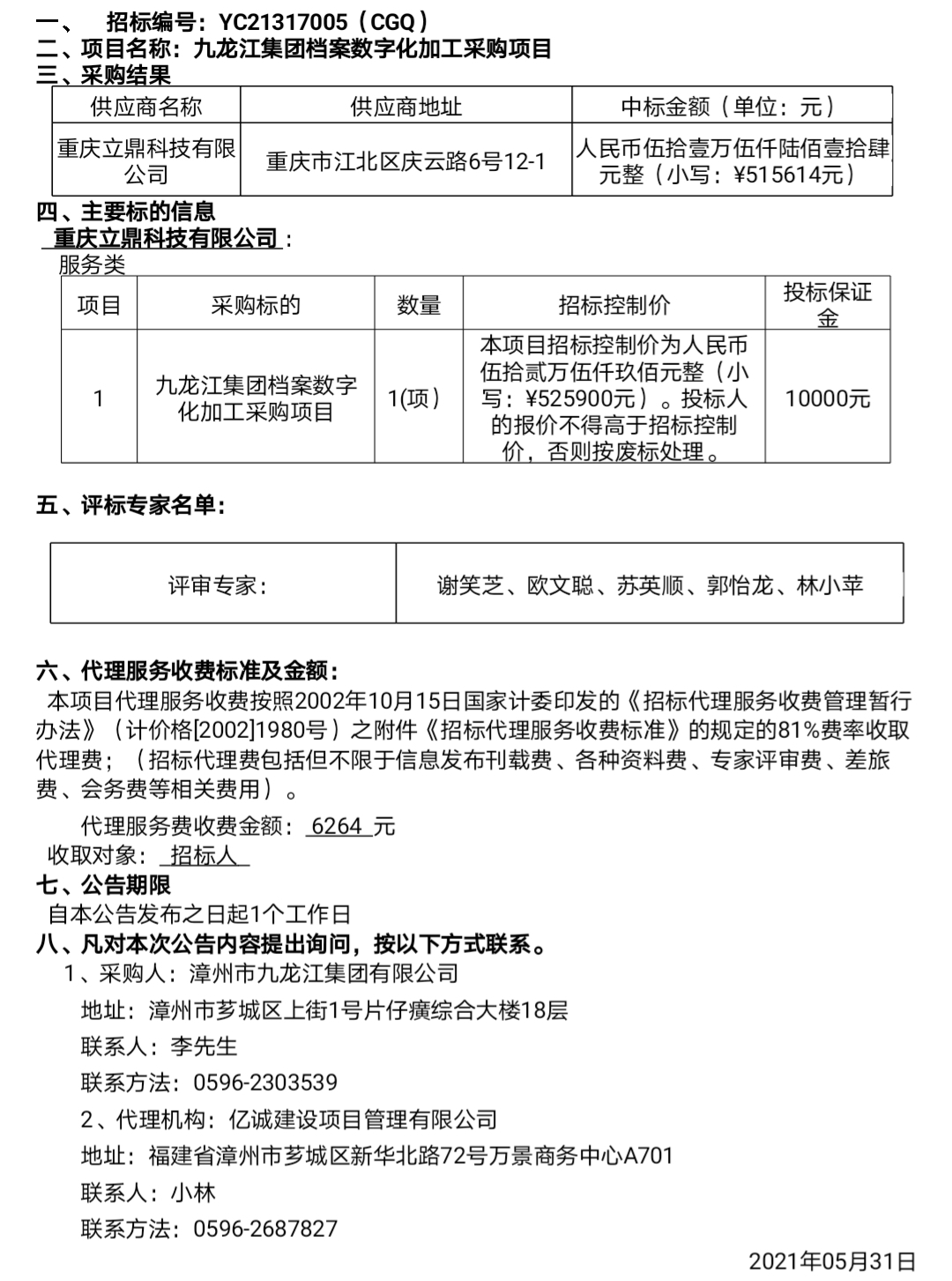 九龍江集團(tuán)檔案數(shù)字化加工采購項(xiàng)目結(jié)果公告