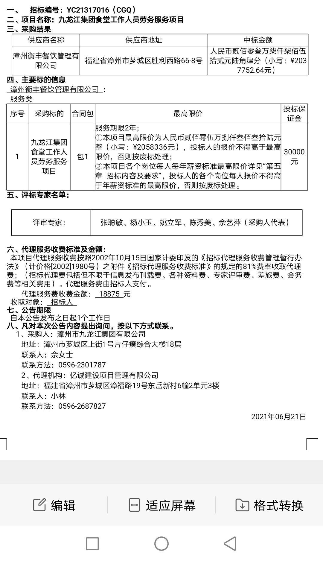 九龍江集團(tuán)食堂工作人員勞務(wù)服務(wù)項(xiàng)目結(jié)果公告